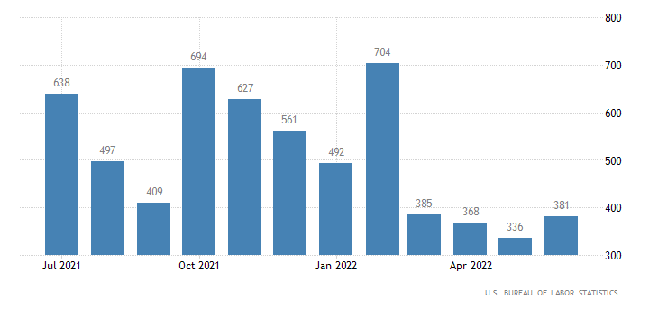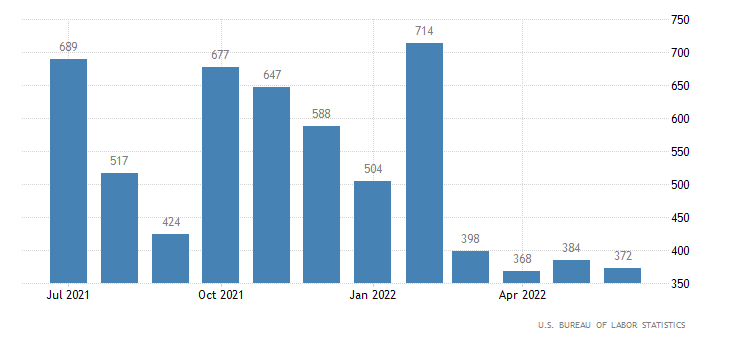 Nel mese di giugno nel settore non-agricolo pubblico sono stati creati 372 mila posti di lavoro; un dato decisamente superiore al consensus fissato a 268 mila, ma inferiore alla rilevazione di maggio di 384 mila (rivisto da 390 mila).