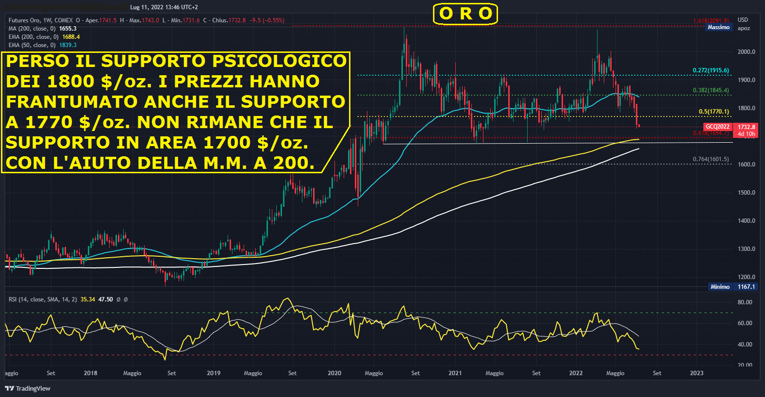 La settimana dell’Oro è si è chiusa a 1742.30 $/oz., con una perdita del – 3,29% che porta ad una perdita del – 4,72% da inizio anno. La settimana della commodity in modalità spot si è chiusa a 1741.80 $/oz. con una perdita del – 3,77%. Di seguito il grafico weekly dell’ORO FUTURES AGOSTO 2022: