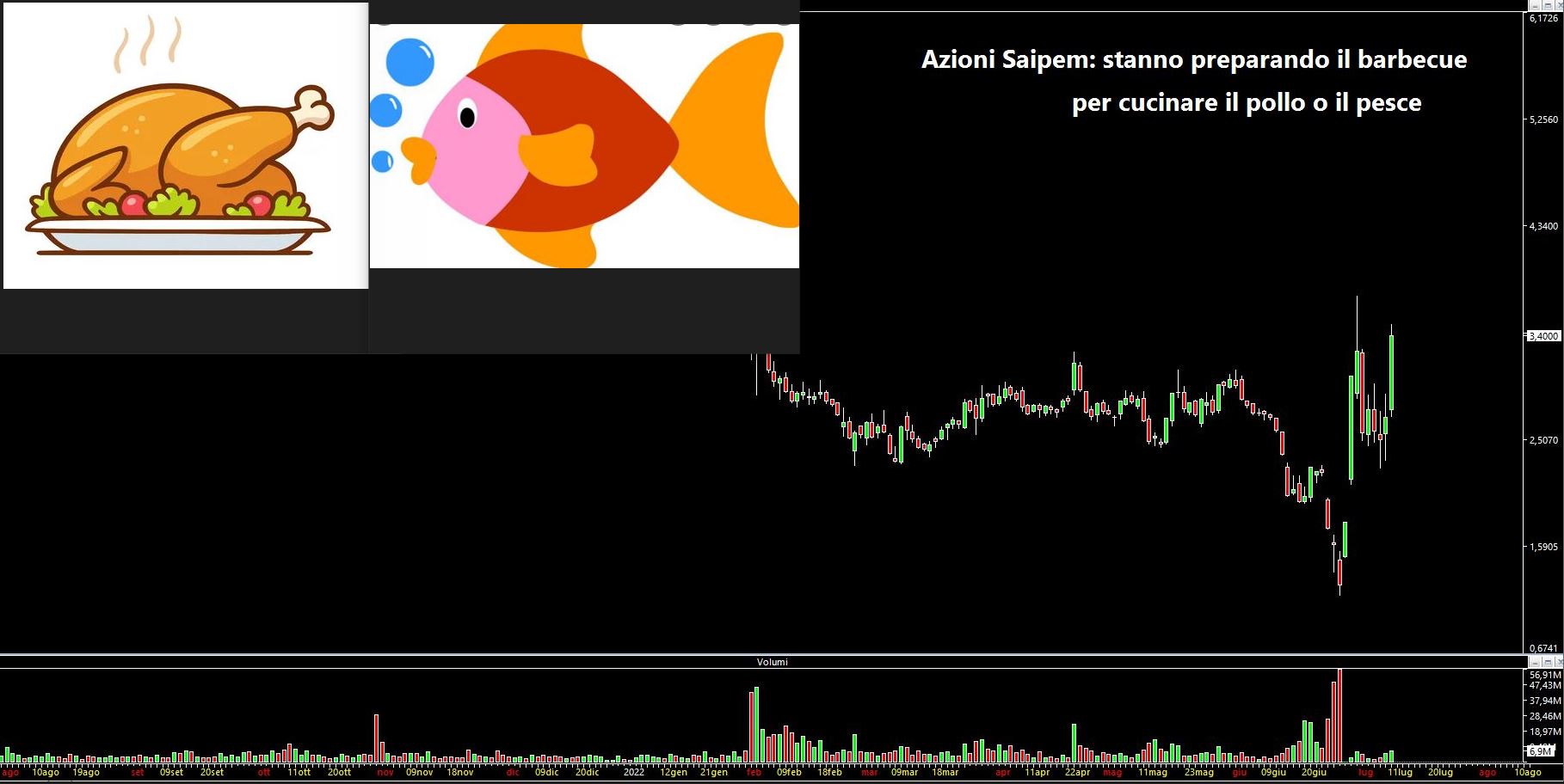 Ovviamente in modo contestuale essendo terminato l'aumento ecco che l'azione Saipem è salita sul bob ed ha iniziato la discesa libera (naturalmente senza freni), dopo che il marinaio truffaldino ha cercato di far abboccare qualche pesce lesso (o qualche pollo) facendo salire senza alcun senso il titolo e creando un movimento ad arte degno del miglior Leonardo (link: https://www.lombardreport.com/2022/7/7/azioni-saipem/). Il grafico si presentava così, ricordate ?