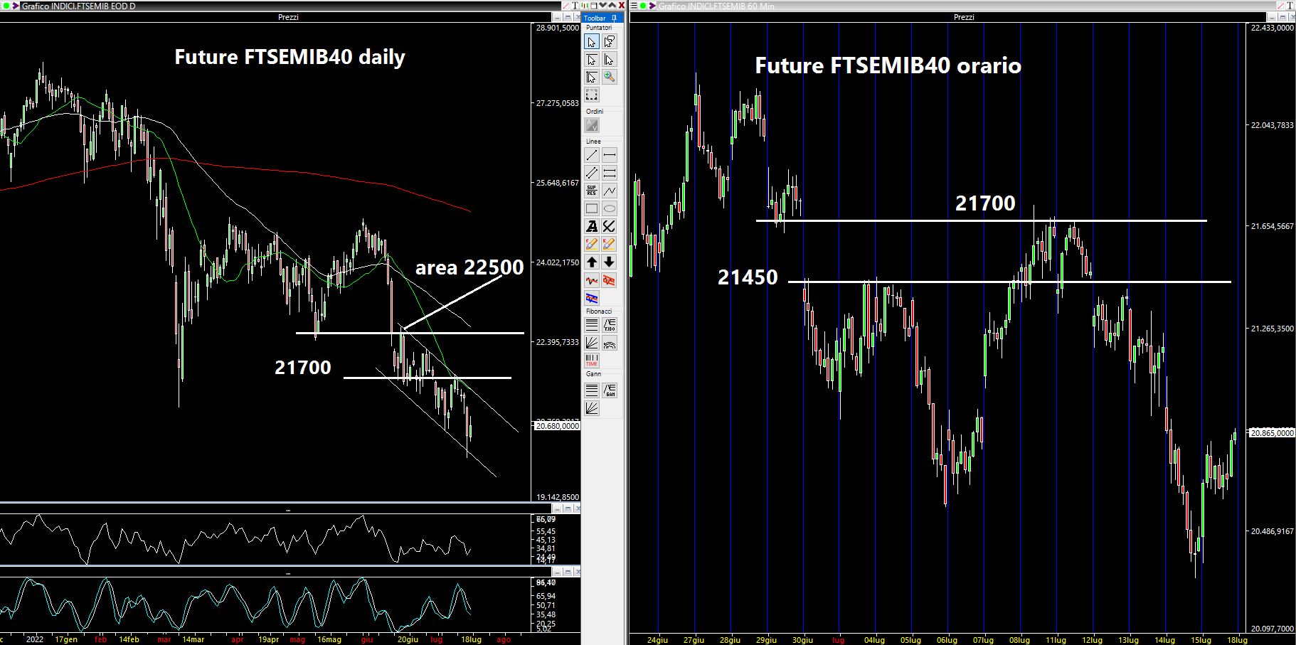 Il mercato italiano continua a scendere ma senza un vero e proprio panico. Osservate nel grafico daily come da un mese a questa parte il trend sia discendente ma ci sia comunque una alternanza di candele rosse e verdi in questa discesa. Insomma: una parte di chi vende si ricopre abbastanza velocemente il giorno seguente proprio come avvenuto nelle ultime due sedute settimanali, anche se il saldo complessivo è sempre in uscita (quindi a ribasso). Le resistenze importanti per la prossima ottava sono molto alte: a 21450 e a 21700.