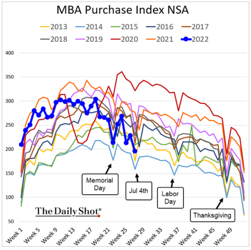 Che qualcosa stia succedendo a livello di economia internazionale lo possiamo vedere da diverse angolature. La prima è la domanda di mutui negli Stati Uniti, che è sotto del 18% rispetto ad un anno fa. Lo si nota distintamente se guardiamo il grafico qui sotto dove la linea blu del 2022 si sta portando verso quella celeste del 2016 che è stato il peggiore anno degli ultimi 10.