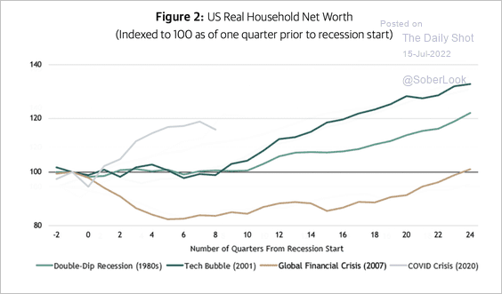 Una delle ragioni per cui questa recessione sarà corta, leggera e poco dannosa è la quantità di denaro che le famiglie hanno accumulato sui conti correnti. Di seguito un grafico che vi farà pensare davvero a come viviamo in tempi non ordinari: la ricchezza odierna delle famiglie paragonata a quella delle precedenti crisi.