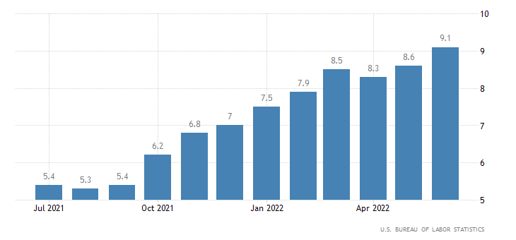 L’indice dei prezzi al consumo a livello mensile a giugno registra una crescita dell’1,3%, andando oltre al consensus del +1,1% e al rialzo di maggio del +1,0%. A livello annualizzato, invece, l’indice dei prezzi al consumo a giugno segna un +9,1%, dopo il +8,6% di maggio e contro un consensus fissato al +8,8%.