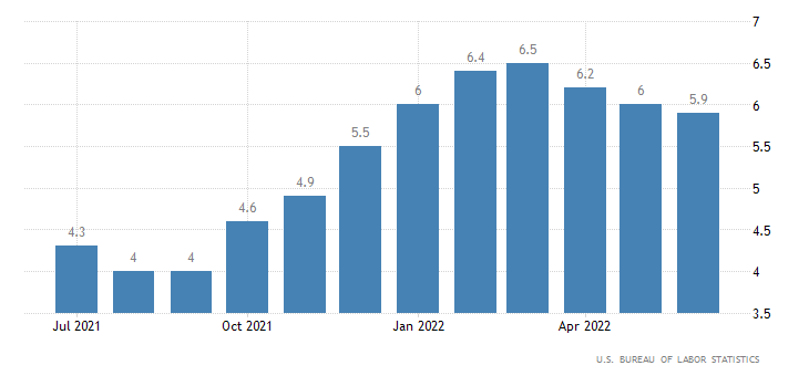 Il dato core (che esclude il settore dell’energia e del cibo) a livello mensile, invece, cresce dello 0,7%: appena sopra al consensus del +0,6% e al dato di maggio del +0,6%. Per quanto riguarda il dato core annualizzato, la crescita di giugno è stata del 5,9%, vale a dire appena sopra al consensus del +5,7%, ma appena inferiore al rialzo di maggio del 6,0%. I dati sono rilasciati dall’U.S. Bureau of Labor Statistics.