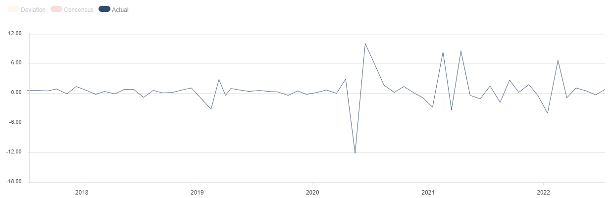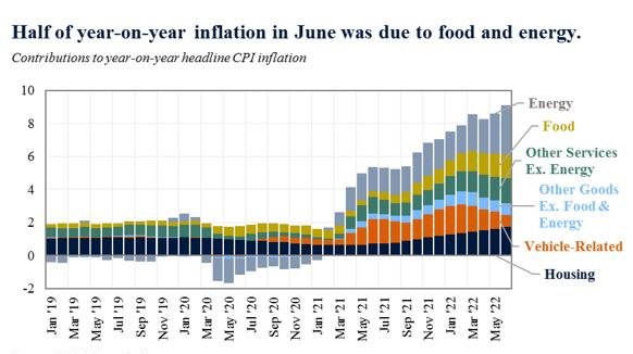 Certamente il dato del CPI USA ha sorpreso al rialzo in maniera significativa oltre le attese già robuste, superando il 9% per la prima volta dal 1981. Superiore alle attese ed in calo solo marginale, il dato core. I dati mese su mese hanno entrambi accelerato parecchio, terminando 0.2% sopra le attese. I protagonisti di questa sorpresa negativa sono i settori dell’energia, cibo e alloggi (v. grafico seguente). I primi 2 contano per oltre la metà del dato (+0.64% e +0.13% del 1.3% mese su mese). La categoria alloggi, responsabile di larga parte della sorpresa, ha aggiunto lo 0.28% spingendo la categoria servizi ai massimi da 31 anni. La componente affitti di prima abitazione ha fatto il record dal 1980, salendo dello 0.78% sul mese.