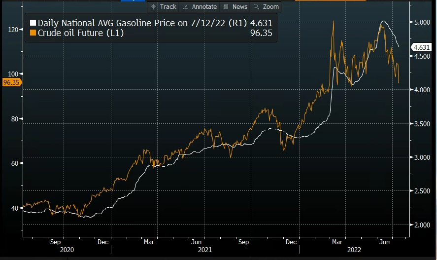 Per quanto riguarda il settore energy, era scontato un forte contributo della categoria al CPI di Giugno visto il nuovo massimo del costo della benzina alla pompa in USA nella prima parte del mese. Ma i venti di recessione stanno impattando anche sui combustibili e questo si inizia già a vedere nei prezzi come mostra il seguente grafico che confronta il “future” sul petrolio (oil) e benzina (gasoline):