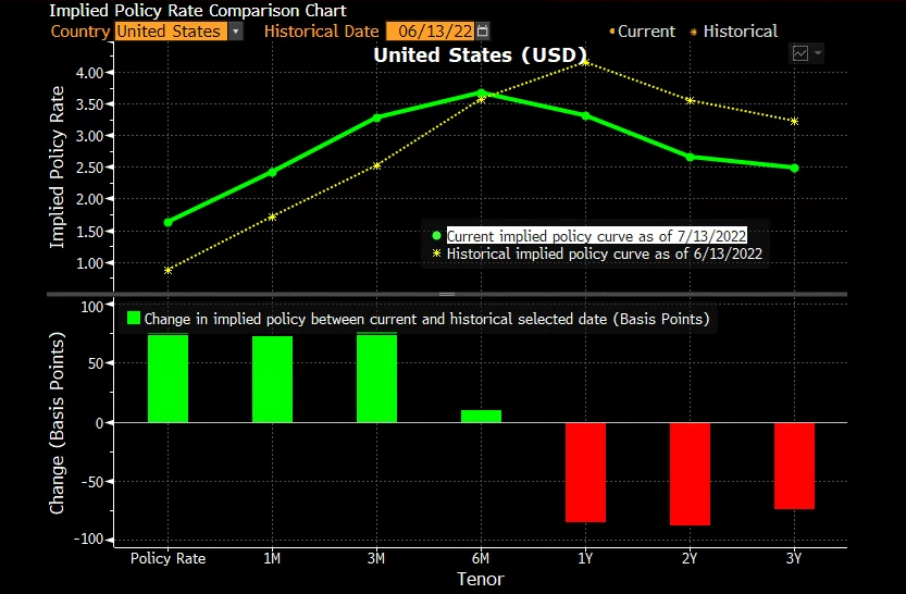 Dando uno sguardo agli investimenti di carattere monetario, dopo il dato del CPI la prima reazione è stata un’esplosione dei tassi al rialzo con i Fed Funds rapidi a scontare una probabilità non bassa di 100 bps di rialzo al FOMC del 27 luglio, con conseguente balzo del Dollaro che ha bucato, momentaneamente, quota 1 contro € (cosa che non succedeva dal lontano 2002). Poi, però, gradualmente i rendimenti hanno cominciato a calare, per passare in negativo a cominciare dalle scadenze più lunghe. Il Dollaro ha perso immediatamente terreno e l'azionario e le commodities hanno respirato. La Fed Funds future strip colloca a gennaio 2023 il picco dei Fed Funds (a 3.75% circa) ma sconta 100 bps di tagli nei 18 mesi successivi. Notare nel seguente grafico il cambiamento rispetto ad un mese fa (linea punteggiata):