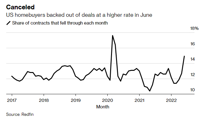 Un altro dato dimostra come non dovremo aspettare troppo per vedere un rallentamento della componente del CPI, in quanto i fondamentali dell'immobiliare USA stanno cambiando a passo di carica. Nel seguente grafico viene riportato il ritmo delle cancellazioni di vendite di case a Giugno scorso, dopo i massimi dal Covid, a indicare come i compratori si stiano tirando indietro: