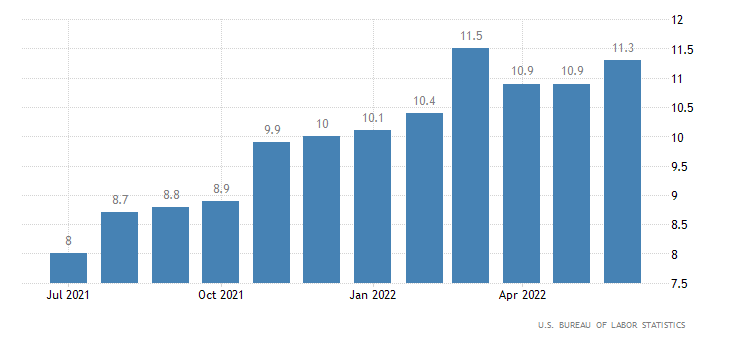 Il dato core, invece, registra un rallentamento dalla crescita dallo 0,6% di maggio (rivista da +0,5%) a quella dello 0,4% di giugno, sotto al consensus del +0,5%. Il dato core, invece, a giugno ha realizzato una crescita dell’8,2%, praticamente in linea con il consensus dell’8,1%, ma inferiore alla crescita dell’8,5% di maggio (rivista da +8,3%). I dati sono rilasciati dall’U.S. Bureau of Labor Statistics.