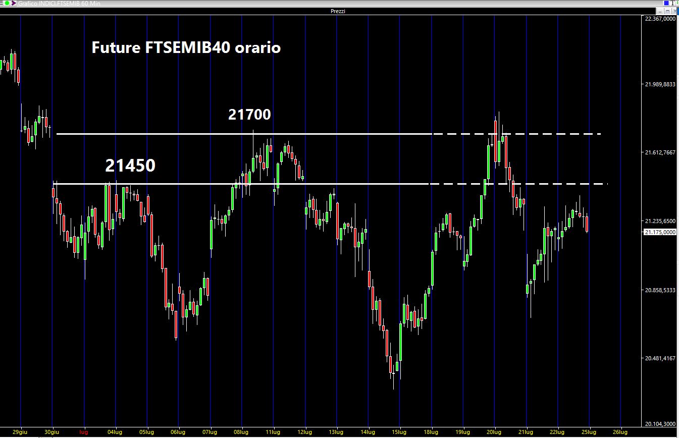 Purtroppo per le problematiche espresse nell'incipit dell'articolo il nostro paese non è riuscito a beneficiare della finestra temporale e dall'inizio del mese siamo in pari o leggermente negativi, ma il quadro complessivo rimane debole e senza particolari spunti. Operativamente parlando avevo indicato un paio di soglie da monitorare sul nostro derivato: i 21450 ed i 21700. In questo quadro estremamente confuso il primo livello non è stato minimamente "sentito" ma ha funzionato molto bene il secondo e più estremo: un bel tappo sia martedì che mercoledì. Dopo il suo test il mercato è sceso cercando poi di recuperare parzialmente la discesa. Come sempre le linee tratteggiate rappresentano l'evoluzione della "previsione".