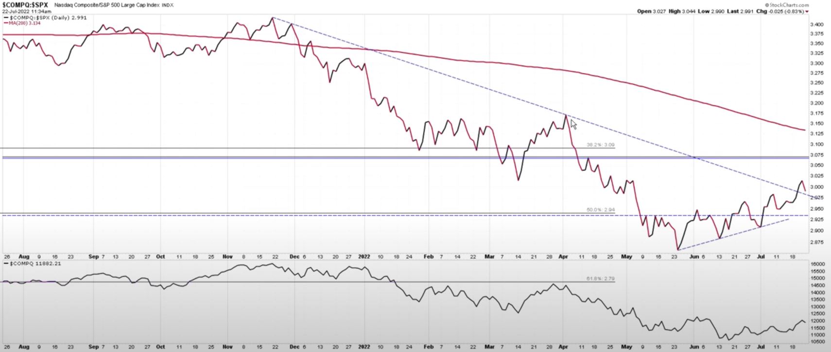 Un ulteriore aspetto positivo è che ultimamente il denaro è affluito più sulla tecnologia che non sulle aziende dell'S&P500. Sono andato a prendere il rapporto tra azioni del Nasdaq ed S&P500 e guardate un pò cosa osserviamo nel grafico che segue: