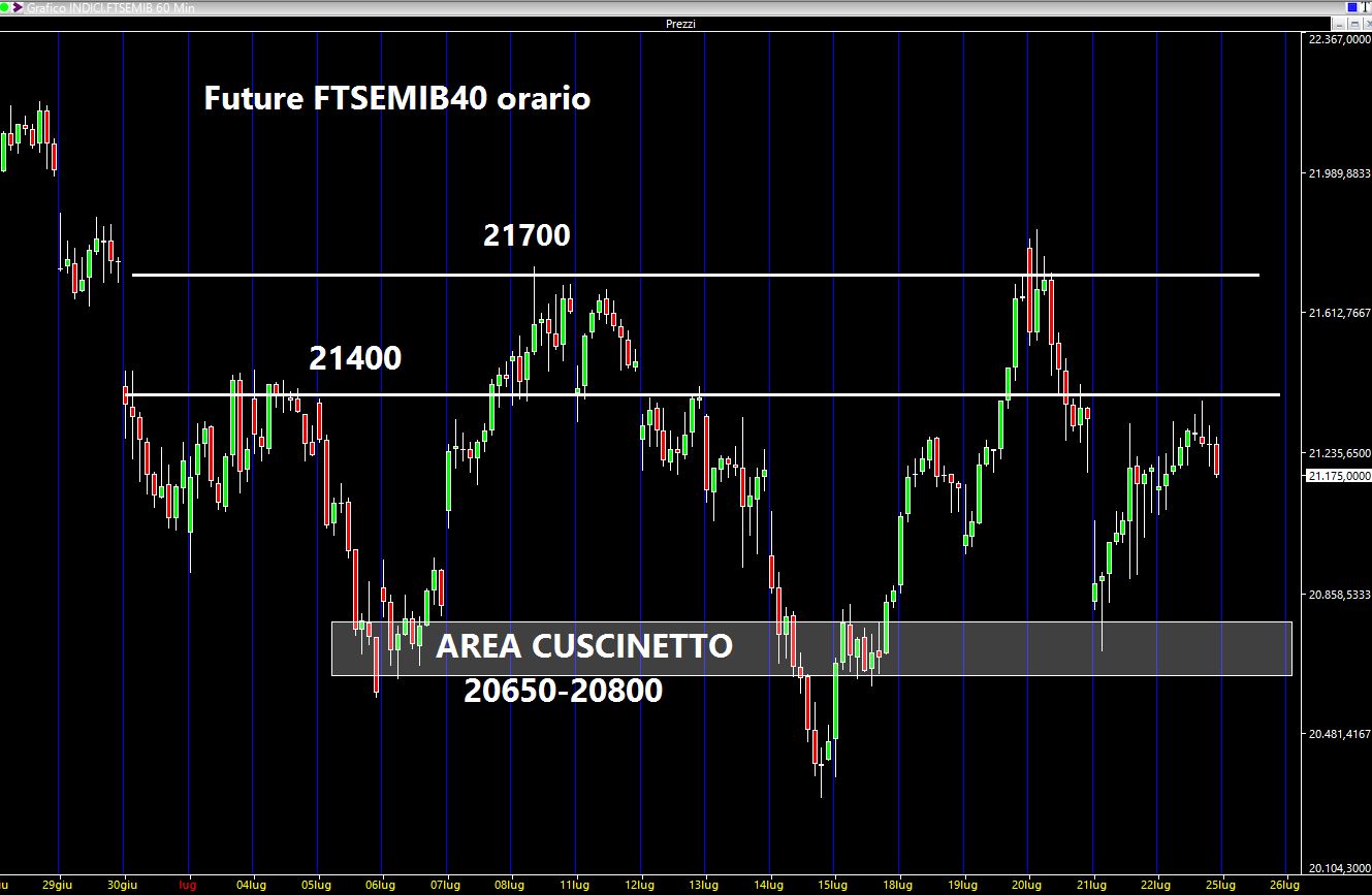 E per la prossima ottava ? Abbasserò l'asticella a 21400 mantenendo i 21700. Al ribasso troviamo un'area "cuscinetto" compresa tra i 20650 punti ed i 20800.