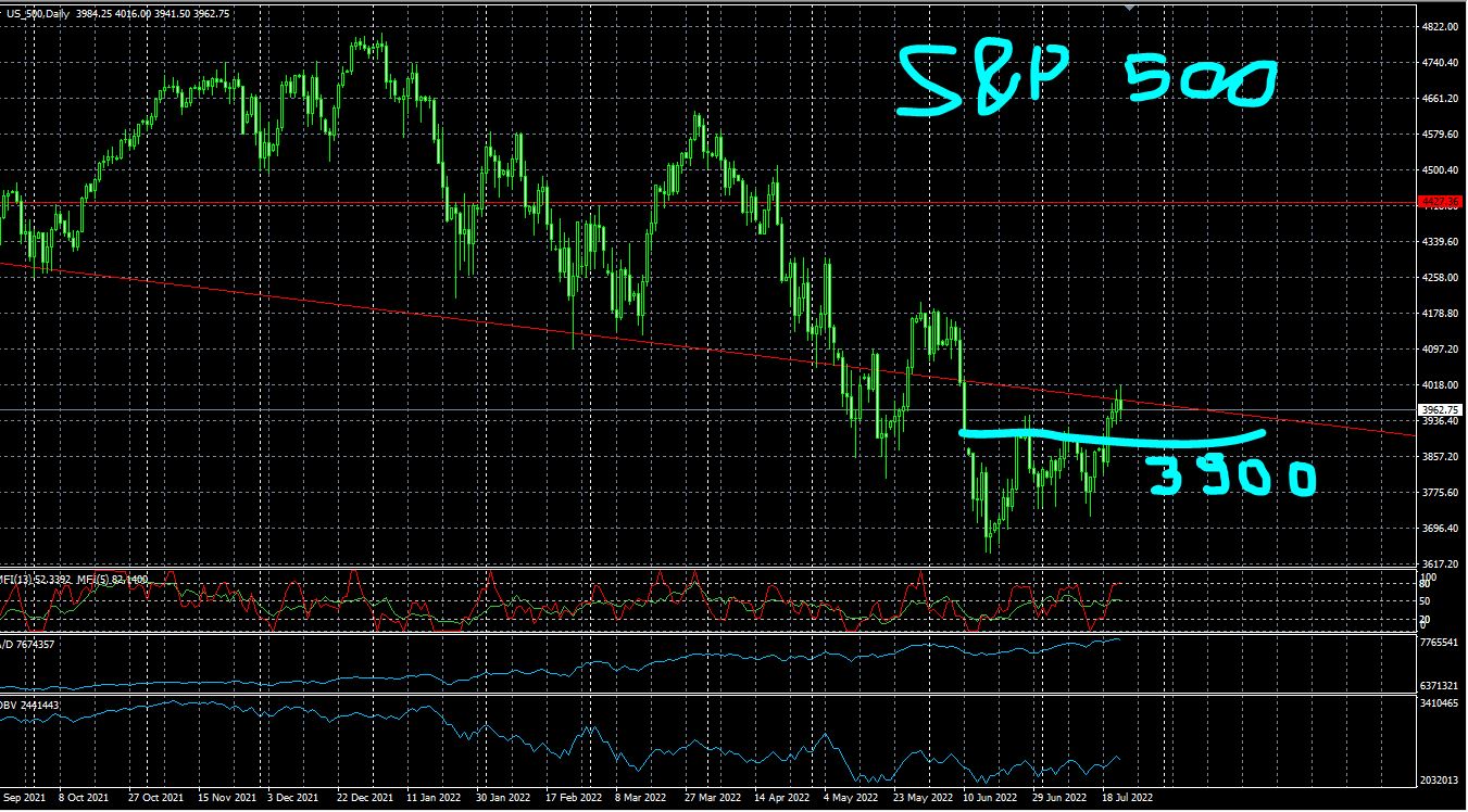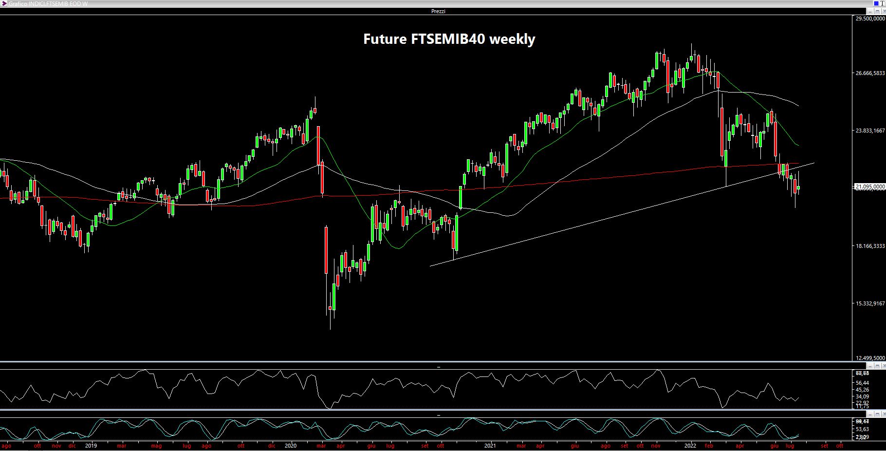 Alla chiusura di venerdì 22 luglio la situazione è di un indice S&P500 che si è riportato a ridosso dei 4000 punti ma che non è tuttavia riuscito a bucarli, del resto sono anche una soglia psicologica. Siamo attorno ai 3965 punti e quindi sarà importante riuscire a rimanere in pianta stabile SOPRA il livello dei 3900. Possibile quindi un loro nuovo test, magari favorito dalla perdita di slancio e di momentum di fine mese, ma l'aspetto che ritengo molto positivo è il fatto che si sia comunque riusciti momentaneamente a bucare una resistenza estremamente importante.