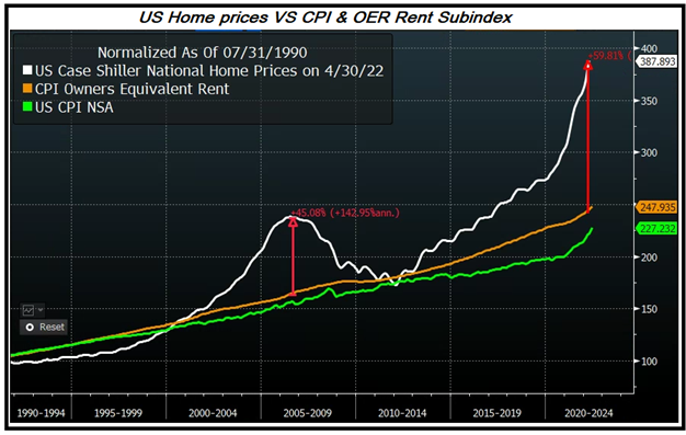 Sembra che ci siano pochi dubbi sul fatto che quella divergenza debba comporsi a discapito dei prezzi, saliti del 30% in 2 anni. Anche senza gli eccessi del 2006, in cui i criteri di affidamento bancario erano pessimi e la speculazione dilagante, questo rientro è destinato a pesare sull'economia, e anche sull'inflazione nei prossimi trimestri/anni.
