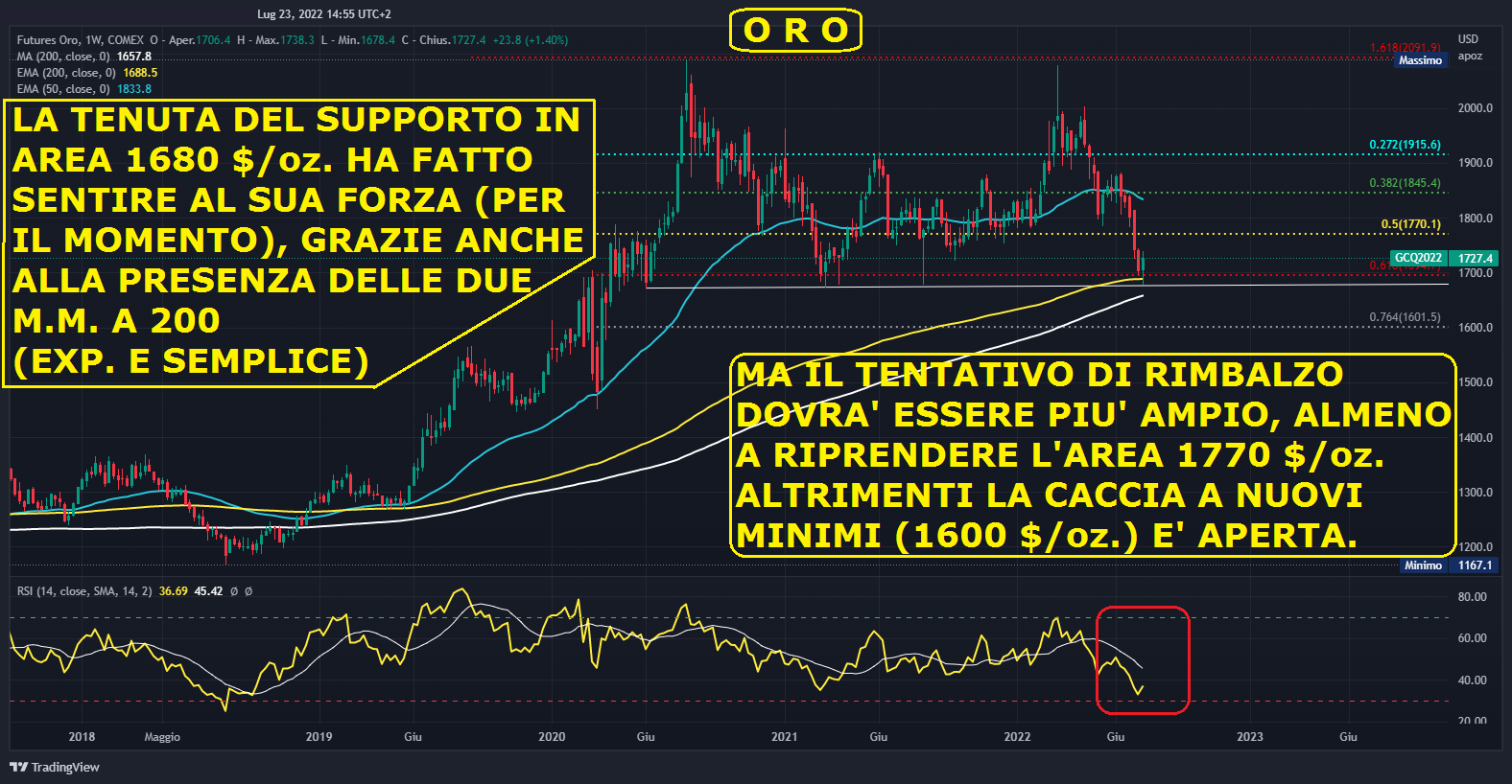 La settimana dell’Oro è si è chiusa a 1727.40 $/oz., con un guadagno del + 1,40% che porta ad una perdita del – 5,53% da inizio anno. La settimana della commodity in modalità spot si è chiusa a 1726.40 $/oz. con un guadagno del + 1,15%. Di seguito il grafico weekly dell’ORO FUTURES AGOSTO 2022: