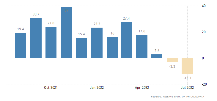 E’ il Philadelphia Fed Manufacturing Index a luglio ad aver riservato la sorpresa più negativa. Al di là del numero dei punti che si attesta a quota -12,3 punti dopo il dato di -3,3 punti di giugno, quarto mese consecutivo in calo e per trovare una rilevazione più bassa di quella di questo mese bisogna tornare a maggio 2020. Ma alcuni dettagli hanno attirato l'attenzione degli operatori. Il sottoindice “nuovi ordini” è calato di 12 punti al minimo dal 2009 (da -12.4 a -24.8 punti). E' stato osservato che un approdo sotto -20 di questo indice ha sempre preceduto, o coinciso, con una recessione. E' successo 7 volte negli ultimi 50 anni e in nessun caso una recessione è stata evitata. Il dato è rilasciato dalla Federal Reserve Bank of Philadelphia.