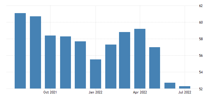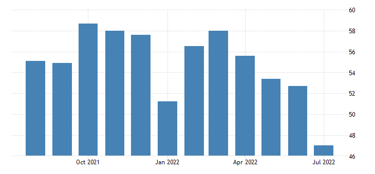 Mentre la sorpresa è data da un rallentamento dell’output dei servizi. Il dato preliminare di luglio scende sotto quota 50 attestandosi a 47 punti, dato più basso da maggio 2020 ad oggi. Il consensus prevedeva un leggero calo, dai 52,7 punti di giugno a 52,6 punti.