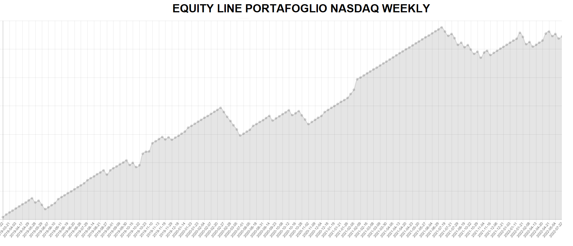 Nonostante la situazione attuale del mercato sia ampiamente ribassista non possiamo certo lamentarci di questa strategia che fin dal giugno 2018 ci sta facendo guadagnare ampiamente su molti titoli, a tal proposito proponiamo l’equity line della strategia Nasdaq Weekly: