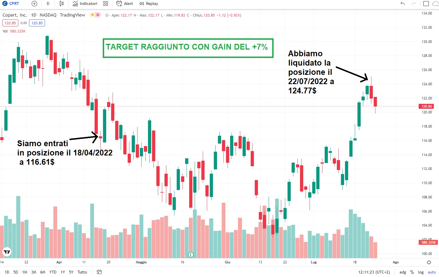 Abbiamo guadagnato un bel +7% su Copart, azienda statunitense che si occupa di aste online internazionali per automobili con migliaia di acquirenti sparsi in tutto il mondo.