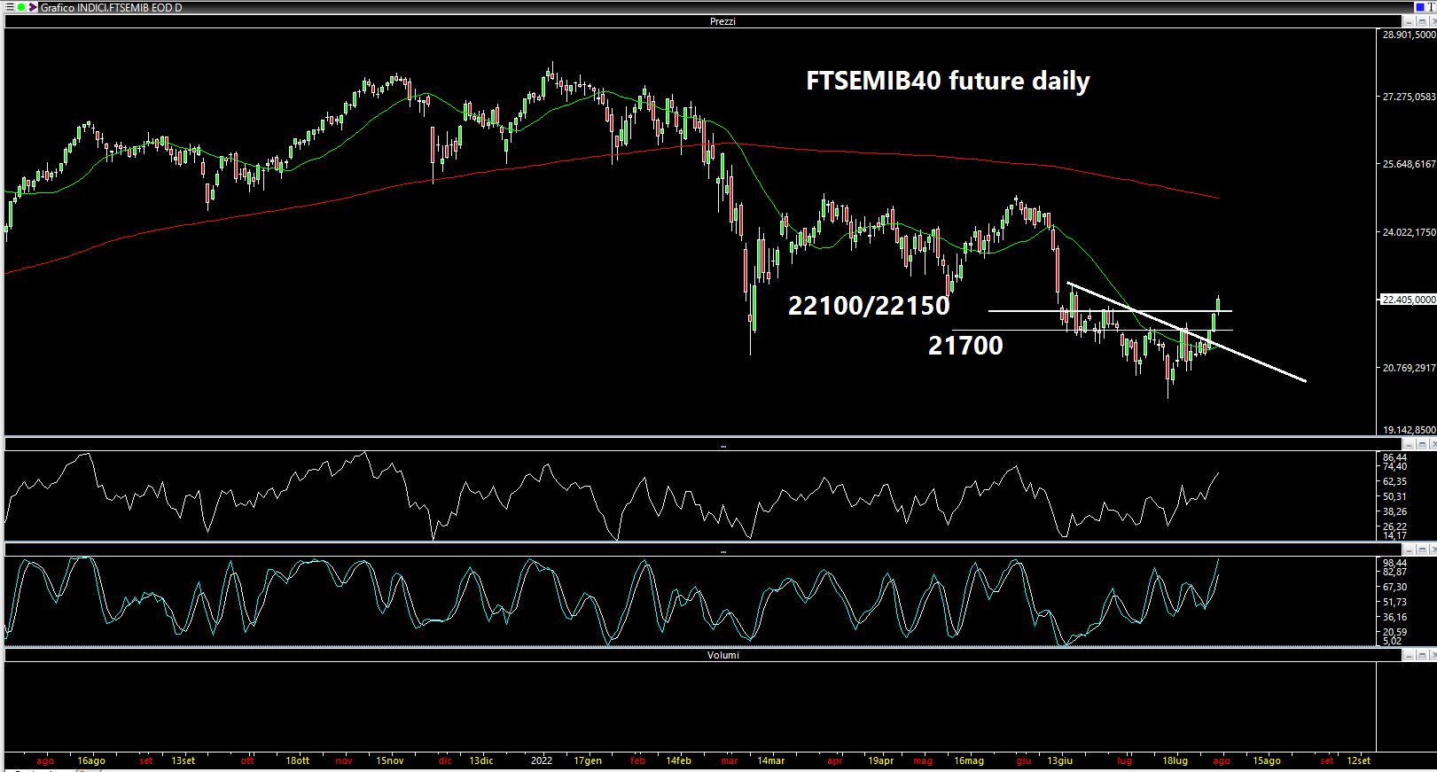 Per la prossima ottava il mood generale potrebbe ancora essere impostato sul risk on: Eventuali pullback sui livelli rotti possono fungere da supporto. Penso certamente ai 21700 evidenziati sopra ed anche ai 22100-22150 visibili sul daily
