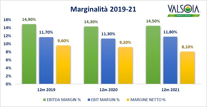 La marginalità di VALSOIA, come riporta il grafico qui sotto, è piuttosto elevata e tendenzialmente stabile (NB: il dato trimestrale non è disponibile). Qual è il problema? Il rincaro subito dalle materie prime ha trovato una parziale rigidità da parte della GDO italiana ad aggiornare (più volte) i listini. Non c'è dubbio che questo aspetto impatti sulla società: VALSOIA, almeno per qualche mese, non è riuscita a trasferire integralmente sui clienti tutti i rincari subiti dagli input. Questo fattore, però, è destinato, gradualmente, ad attenuarsi.