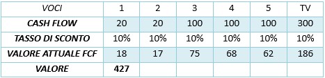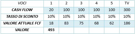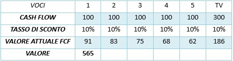 Nella tabella (molto semplificata) vengono indicati i vari flussi di cassa previsti per un’ipotetica azienda per i prossimi 5 anni. A ciò viene aggiunto anche il valore dei flussi previsti nel “Terminal Value”. Per ipotesi immaginiamo di utilizzare un tasso di sconto pari al 10%.