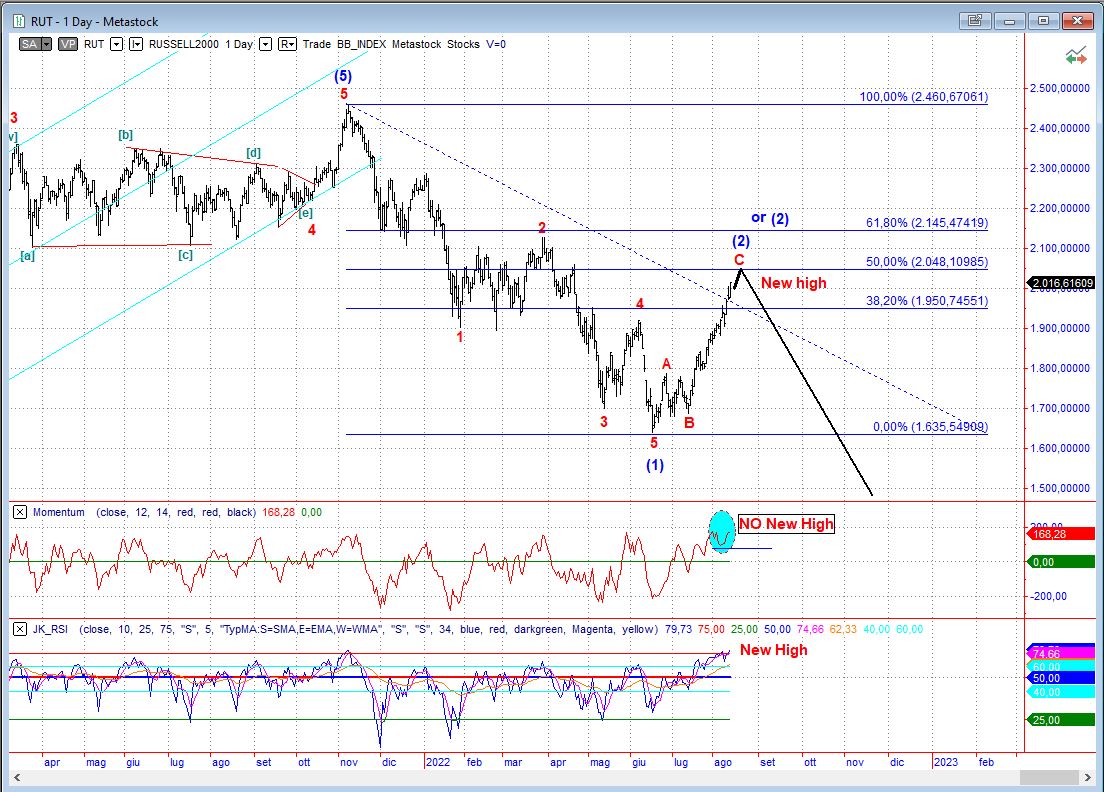 Sul fronte dei prezzi il prossimo target per il Russel è fissato a 2048 punti, che rappresenta il punto in cui l’onda (2) avrà ripercorso il 50% dell’onda (1) e se prosegue il target successivo sarà 2145 punti dove il ritracciamento avrà raggiunto il 61,8%.