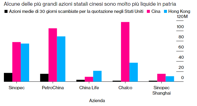 Oggi, lunedì 15, le più importanti imprese statali cinesi che intendono lasciare le quotazioni sulle borse statunitensi hanno chiuso in perdita le contrattazioni sulla borsa di Hong Kong. PetroChina Co. ha perso il 3,4%, mentre China Life Insurance Co. e China Petroleum & Chemical Corp. hanno perso oltre il 2% ciascuna. In calo anche Sinopec Shanghai Petrochemical Co Ltd. e Aluminium Corp of China Ltd. La fretta di lasciare il mercato statunitense è stata vista come un riflesso dell'aumento delle tensioni bilaterali tra le due nazioni e della mancanza di progressi nel raggiungimento di un accordo per fornire alle autorità di regolamentazione americane un migliore accesso ai dati finanziari delle società cinesi. Mentre alcuni analisti si aspettavano che la mossa avrebbe avuto un impatto limitato sul prezzo delle azioni dato il modesto volume di scambi delle azioni negli Stati Uniti, la reazione del mercato suggerisce che i trader restano diffidenti nei confronti dell'ulteriore incertezza in un momento in cui l'economia sta rallentando. Il seguente grafico mostra, comunque, come le ADR cinesi vengono scambiate a Wall Street con volumi nettamente inferiori alle borse di provenienza:
