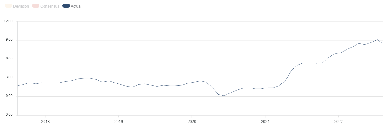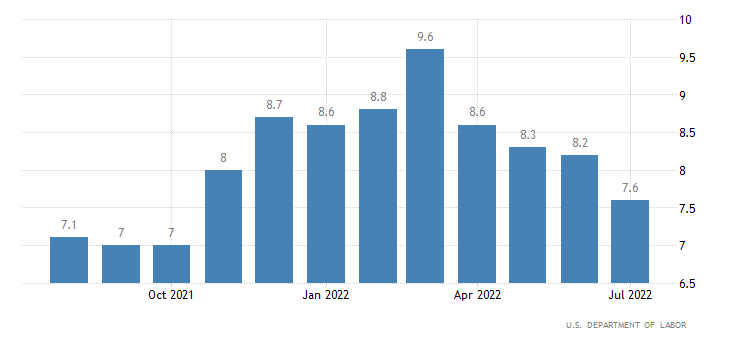 L’indice dei prezzi al consumo a livello annualizzato a luglio rallenta all’8,5%, un dato inferiore a quello previsto dal consensus fissato a 8,7% e anche a quello di giugno del 9,1%. Il dato è rilasciato dall’U.S. Bureau of Labor Statistics.