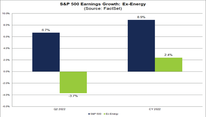 Per il secondo trimestre 2022, il tasso di crescita degli utili combinati per l'S&P500 è del 6,7%. A livello di settore, sei settori registrano una crescita anno su anno degli utili per il trimestre. Tuttavia, il settore dell'energia registra la più alta crescita degli utili di tutti gli 11 settori al 299%. Il settore dell'energia è anche il maggior contributore alla crescita degli utili per l'S&P 500 per il secondo trimestre del 2022. Il settore sta registrando un aumento aggregato anno su anno degli utili pari a 47,7 mld $, mentre l'S&P500 complessivamente registra un aumento aggregato anno su anno dei ricavi pari a 31,1 mld $. Infatti, escludendo il settore energetico, l'S&P 500 riporterebbe un calo anno su anno degli utili del 3,7% anziché un aumento anno su anno degli utili del 6,7%.