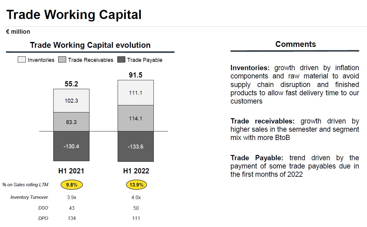 Per evitare potenziali interruzioni di produzione determinate dalle note difficoltà di approvvigionamento, il mangement, nel 2022, ha deciso di aumentare il quantitativo di ordini di magazzino. Tale decisione se da una parte ha consentito a TECHNOGYM di poter registrare ricavi superiori al periodo pre-crisi, dall’altra ha inevitabilmente determinato un (temporaneo) assorbimento di cassa. Il Capitale circolante è aumentato di 36,3 mln.