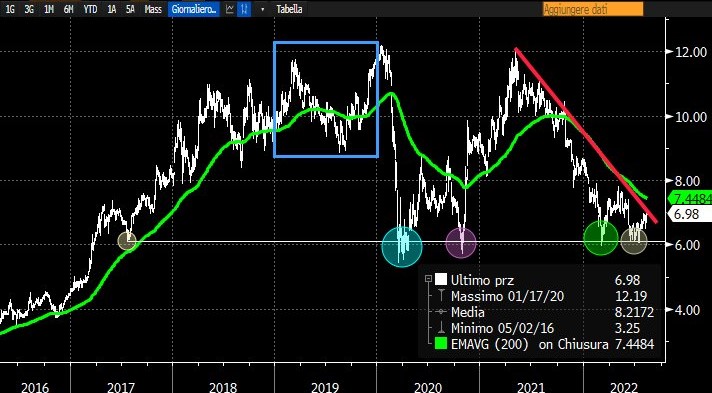 Il titolo, dai massimi raggiunti a giugno 2021, ha pesantemente ripiegato rimbalzando per ben due volte sul supporto in aera € 6.