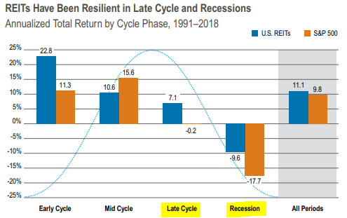 Guardate questo grafico. È evidente come i classici Reits (seppur limitatamente alla realtà Usa) costituiscano una difesa patrimoniale in quasi tutte le fasi economiche.