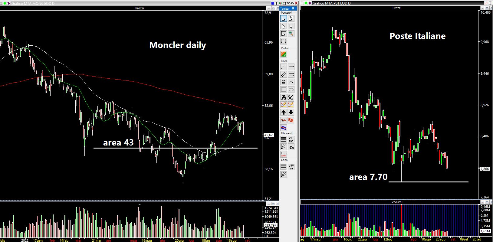 Il quadro tecnico esposto apre lo spazio ad un possibile ulteriore allungo ribassista per la giornata di lunedì grazie alla rottura di soglie tecniche importanti. Fineco pare diretta verso i 10.20/10.30 (minimi di giugno), Unicredit potrebbe essere attratta verso l'area a 8.80 euro dove si trova un gap up da chiudere, Moncler in area 43 chiuderebbe un gap up, Poste Italiane pare nuovamente diretta verso 7.70, Leonardo si è indebolita parecchio nelle ultime settimane dopo il rally dei mesi scorsi e sembra andare alla ricerca di 8.10 euro, Amplifon è vicinissima alla rottura dei 26 euro che potrebbe portare ad un ulteriore indebolimento verso i 25 euro. Estrema cautela quindi e operatività per trader esperti e non per cassettisti dal momento che siamo in fase correttiva. Potrei andare avanti con altri titoli e il risultato non cambierebbe di molto, ma non voglio continuare con questa triste litania.
