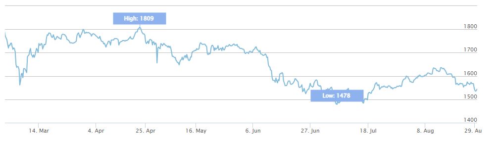 Come ben sapete queste ultime settimane sono state particolarmente patetiche, apatiche e noiose e contro la mia statistica dal momento che, operativamente parlando, agosto è sempre stato un ottimo mese. Personalmente non mi piace perdere tempo visto che il tempo è una risorsa limitata e quindi nei giorni scorsi ne ho approfittato per mettermi a studiare: il bello è che non si finisce mai di imparare cose nuove e in questo senso possiamo tranquillamente dire che ci troviamo in una miniera d'oro in tutti i sensi, anche se talvolta non si incappa in un filone d'oro o d'argento ma in uno di carbone. Sperando che non sia questo il caso, ho trovato un certificato con ISIN IT0005341042 avente come sottostante l'indice Euro Stoxx Select Dividend 30 che rappresenta le 30 società europee ad alto rendimento (che hanno praticamente già staccato il dividendo che influenzerebbe negativamente l'indice): Aegon, Ageas, Ahold, Allianz, ASR Nederland NV, Generali, Axa, Covivio, Credit Agricole, Deutsche Post, EDF, EDP Energias de Portugal, Evonik, Fortum,Gecina,Kesko,Muenchener Rueck, NN Group, Nokian Renkaat,OMV, Orange, Poste Italiane, Proximus, Publicis, Sampo, Sanofi, Siemens, Snam Rete Gas, TAG Immobilien AG, Volkswagen. Di seguito il grafico dell'indice il cui minimo toccato a luglio di quest'anno è stato pari a 1478 punti.