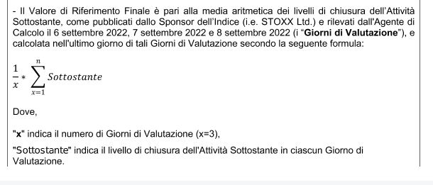 L'emittente considererà valide ai fini del rimborso le quotazioni dell'indice in chiusura di seduta che verranno rilevate il 6, 7 ed 8 settembre 2022, facendone la media aritmetica secondo la seguente formula così come riportato sul sito di Borsa Italiana nel relativo prospetto al punto C19 di pagina 37/235: