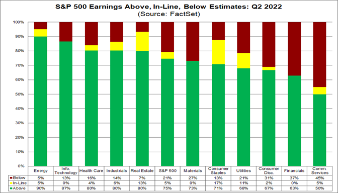 Come dicevamo, entriamo più nel dettaglio per quanto riguarda la stagione delle trimestrali dell’indice S&P500. Complessivamente, l'87% delle società dell'S&P 500 ha riportato risultati effettivi per il secondo trimestre del 2022 fino ad oggi. Di queste società, il 75% ha riportato un EPS effettivo al di sopra delle stime, che è superiore alla percentuale del 73% della scorsa settimana ma inferiore alla media quinquennale del 77%. Complessivamente, le aziende registrano utili superiori del 3,4% alle stime, una percentuale superiore alla percentuale del 3,1% della scorsa settimana ma inferiore alla media quinquennale dell'8,8%.