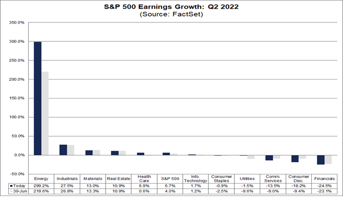 Il tasso di crescita degli utili misto (combina i risultati effettivi per le società che hanno riportato e stimati per le società che non hanno ancora comunicato) per il secondo trimestre è del 6,7% oggi, rispetto a un tasso di crescita degli utili del 5,8% la scorsa settimana e un tasso di crescita degli utili del 4,0% alla fine del secondo trimestre (30 giugno). Le sorprese positive sugli utili segnalate da società di più settori (guidate dai settori dell'energia e dell'assistenza sanitaria) sono state responsabili dell'aumento del tasso di crescita degli utili nell'ultima settimana. Le revisioni al rialzo delle stime dell'EPS e le sorprese positive sugli utili per le società del settore energetico hanno contribuito maggiormente all'aumento complessivo del tasso di crescita degli utili dell'indice dalla fine del secondo trimestre (30 giugno).
