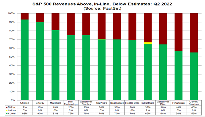 In termini di ricavi, il 70% delle società dell'S&P 500 ha riportato ricavi effettivi superiori alle stime, che sono superiori alla media quinquennale del 69%. Complessivamente, le aziende registrano ricavi superiori del 3,5% rispetto alle stime, una percentuale superiore alla media quinquennale dell'1,8%. Se il 3,5% è la percentuale finale per il trimestre, segnerà la terza percentuale di sorprese sui ricavi più alta riportata dall'indice da quando FactSet ha iniziato a monitorare questa metrica nel 2008.