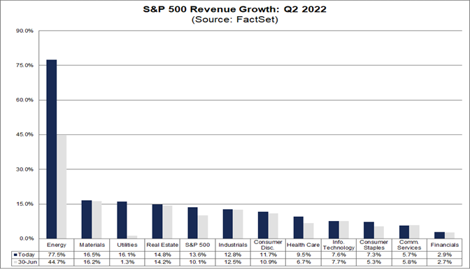 Se il 13,6% è il tasso di crescita effettivo per il trimestre, segnerà il sesto trimestre consecutivo di crescita dei ricavi anno su anno superiore al 10% per l'indice. Tutti gli 11 settori registrano una crescita anno su anno dei ricavi, guidata dal settore energetico.