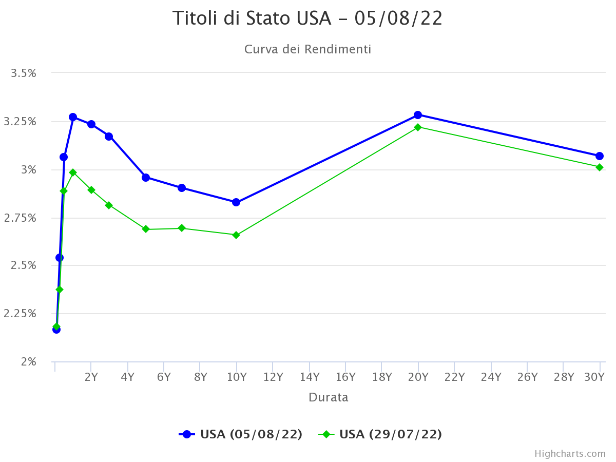 Dando uno sguardo agli investimenti di carattere monetario, il buon tenore dei dati macro usciti nella settimana appena trascorsa, soprattutto del mercato del lavoro, lascia intendere che quasi sicuramente nella prossima riunione del FOMC il rialzo dei tassi sarà per altri 75 bps. Rispetto alla scorsa settimana possiamo notare dal seguente grafico come tutte le varie scadenze dei titoli di stato USA, abbiano subito un rialzo, con il tratto 2-10Y che continua ad essere invertito chiudendo la settimana ad un nuovo minimo di - 40 bps.