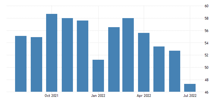 Per quanto riguarda il settore dei servizi, il PMI rilasciato da Markit Economics registra il quarto mese consecutivo in calo scendendo sotto quota 50 punti. Il dato è passato dai 52,7 punti di giugno ai 47,3 punti di luglio (dato comunque superiore a quello preliminare di 47,0 punti).