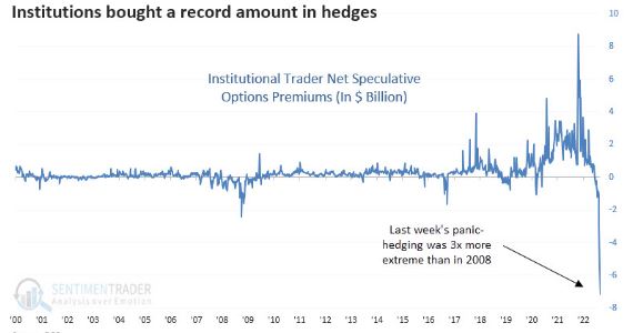 Nella passata settimana c'è poi stato un massiccio acquisto di opzioni put da parte di istituzionali, qualcosa che non si è mai visto negli ultimi 22 anni come mostra il grafico seguente (Fonte: SentimenTrader). Questi operatori hanno "buttato via" 8.1 miliardi di dollari per l'acquisto di protezione anche se il Vix, l'indice di volatiltià, non è aumentato (forse perché sono state acquistate su scadenze più lunghe o su azioni non comprese nell'S&P500). La linea blu rappresenta la spesa per le opzioni put e riflette il valore netto dei premi spesi per l'acquisto di call al netto delle put. Anche se gli istituzionali si possono sbagliare, una domanda sorge spontanea: perchè e da cosa si vogliono proteggere ?