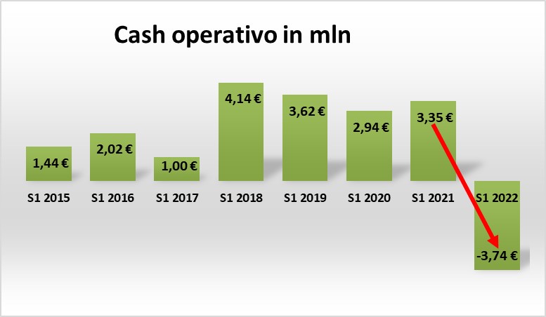 Come emerge dal grafico qui sotto, nel primo semestre 2022, nonostante l’ottimo andamento dei ricavi si è verificata una contrazione di liquidità. I flussi operativi (al lordo del Capex) risultano negativi per - € 3,74 mln.
