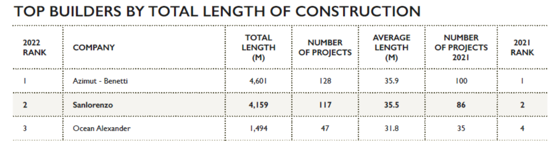 Nella classifica annuale 2021 del Global Order Book redatta dalla rivista internazionale di nautica Boat International, Sanlorenzo si è riconfermata primo cantiere monobrand al mondo nella produzione di yacht e superyacht superiori a 24 metri e il secondo cantiere navale a livello mondiale, con 117 progetti in realizzazione nel 2021.
