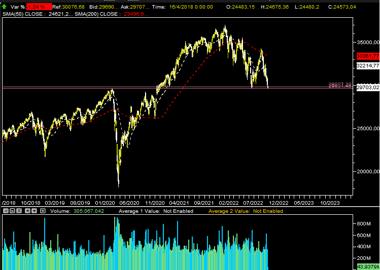 Nell'immagine di sotto invece, la dinamica attuale per il Dow Jones a ridosso dei punti cruciali sopra indicati.