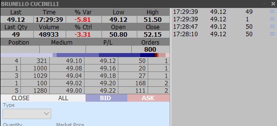 Oggi analizziamo un caso inverso che mi è balzato all'occhio sul finale di seduta di giovedì: azioni Brunello Cucinelli. In questa situazione troviamo una lettera apparentemente scarica: 50 pezzi sul primo livello, 20 sul secondo e 27 sul terzo. Nella realtà dei fatti il software è stato tarato con la modalità di vendita continua "a goccia" come la chiamo io, segno che la vendita è reale. Cosa voglio dire? Molto semplice. Nel lato destro del book vedete che qualche sprovveduto acquista per ben tre volte 50 pezzi totali SEMPRE al prezzo di 49.12 euro ad azione. Stranamente però la prima lettera ricompare in continuazione proprio perché l'algoritmo è stato tarato in modalità one way (a senso unico se preferite). Il fatto che in AUTOMATICO venga rigenerata la lettera da 50 pezzi serve al venditore per non farsi vedere e quindi permettere una discesa lenta e costante del titolo senza grossi strappi ed invogliando qualcuno ad acquistare. Una discesa appunto "a goccia" senza dare nell'occhio (era infatti partita dall'area 50 euro). Rimane però un punto: gli ordini asteriscati o iceberg devono avere un controvalore minimo pari a diecimila euro come da regolamento. In altri termini se volessi vendere ad esempio 100 mila euro di Cucinelli al prezzo di 49.12 euro ad azione, dovrei mettere un ordine in cui ciascuna vendita è almeno da 10 mila euro (magari cinque da 20 mila). Capite bene che una macchinetta che rigenera la quantità di 50 pezzi SENZA far "scavallare" il titolo NON utilizza assolutamente un controvalore di 10 mila euro: 49.12 euro moltiplicato 50 dà un risultato di soli 2456 euro. Questa tipologia di vendita ha poi permesso un ulteriore ribasso nella giornata successiva fino al prezzo di 47 euro nella seduta già debole di venerdì (-4%).