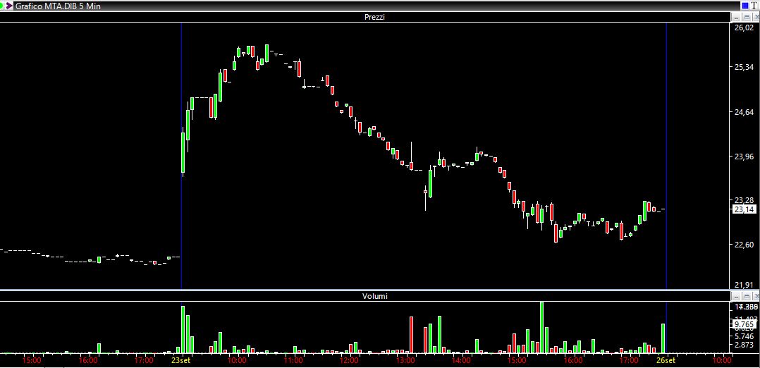 Di seguito il grafico a cinque minuti di Digital Bros: dopo aver forzato le quotazioni al rialzo gli algoritmi hanno fatto cassa, segno che la salita iniziale era completamente priva di fondamenta.