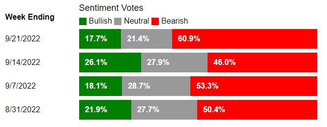 Andando oltreoceano avevamo visto come la rottura del supporto sull'S&P500 potesse in qualche modo provocare un allungo al ribasso (link: https://www.lombardreport.com/2022/9/17/immobiliare-s-p500-azioni-banca-generali/). In settimana l'affondo ha portato i corsi a testare i minimi di giugno quasi al tic. Questa estate non mi sarei aspettato di rivederli ma alla fine è stato così, per questo credo che in Borsa sia sempre fondamentale procedere passo dopo passo o se preferite settimana dopo settimana, sempre pronti a cambiare idea. Di seguito trovate l'S&P500 su scala giornaliera. Potrebbe essere un doppio minimo ma il contesto generale (mi riferisco alle variabili macro e geopolitiche) non è assolutamente mutato, anzi. Ed i fondamentali contano come ben sapete. Sarà da valutare il comportamento attorno a questi livelli. L'ideale sarebbe un minimo di consolidamento/difesa in un loro intorno per poi provare un affondo, magari a caccia di stop per poi invertire nuovamente e cogliere il periodo favorevole all'upside (ultimo trimestre come ho scritto fino ad oggi). L'unico aspetto positivo consiste nel fatto che secondo il Sentiment Survey (indicatore contrarian che fornisce l'opinione degli investitori sull'andamento della Borsa da oggi a sei mesi) abbiamo uno dei venti valori a favore dei rialzisti (17.7%) più bassi dal 1987 ad oggi contro uno dei cinque più elevati valori a favore dei ribassisti (60.9%). In altri termini i rialzisti si contano sulle dita di una mano mentre i ribassisti sono aumentati notevolmente nell'ultima ottava rispetto alle settimane precedenti. Questo naturalmente NON significa che il mercato debba salire ma denota un marcato sbilanciamento dei ribassisti verso i rialzisti e gli eccessi vengono prima o poi corretti come abbiamo già visto nel recente passato.