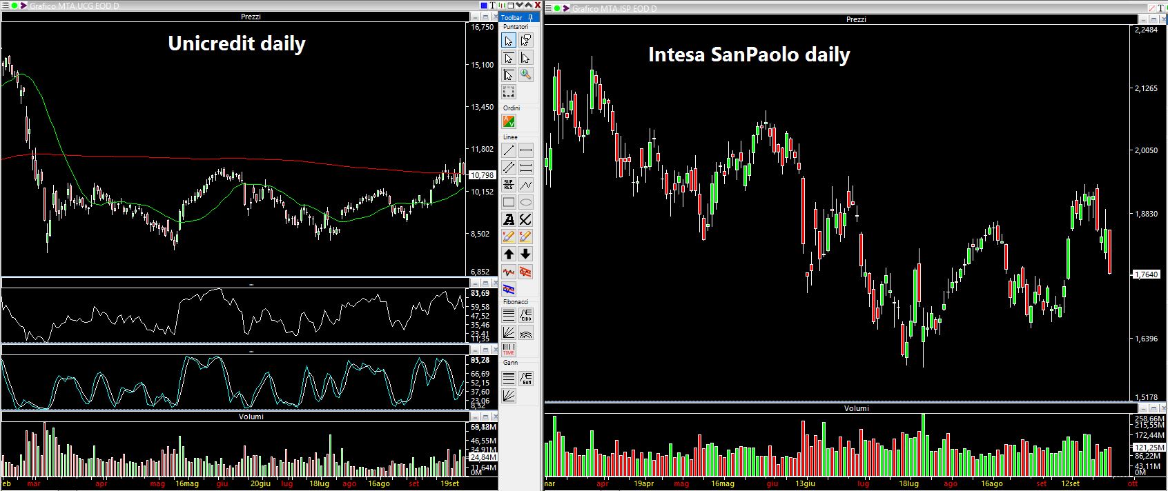 Come scritto precedentemente alcuni comparti reggono meglio MA non forniscono segnali convincenti: a sedute di euforia seguono infatti giorni di ribassi consistenti. E' accaduto ad Unicredit che dopo aver fatto segnare un rialzo del 7% giovedì è poi scesa del 4% il giorno successivo. Stessa cosa per Intesa SanPaolo: in un paio di sedute (martedì e giovedì) ha annullato il rialzo delle due settimane precedenti. La Borsa richiede coralità di movimento e soprattutto consolidamento, cosa che attualmente non vedo da nessuna parte.
